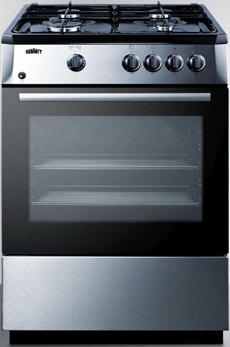 SUMMIT PRO24G is a 24" wide gas range with deluxe features and a unique European design. Designed and constructed in Europe, the PRO24G uses electronic ignition and includes four sealed Sabaf® burners, with a waist-high broiler located inside the oven for cooking convenience. The cooking surface is jet black, with two sets of continuous grates in a matching finish and a curved stainless steel manifold for a modern look. This 'slide-in' style range comes without a backguard, allowing you to integrate the unit into your own kitchen setup. Alternatively, we offer a 10" high backguard in stainless steel as an accessory for this unit (some assembly required). For this option, see the BG24. The PRO24G has a black trimmed oven door with a pro stainless steel handle and a window for easy monitoring. The oven includes a light and two slide-out racks with five positions to allow more flexibility in baking and broiling. A drop-down storage compartment offers added convenience. At 24" wide, the PRO24G is ideal for apartments and other small kitchens looking to add a touch of style in a slim-fitting size.