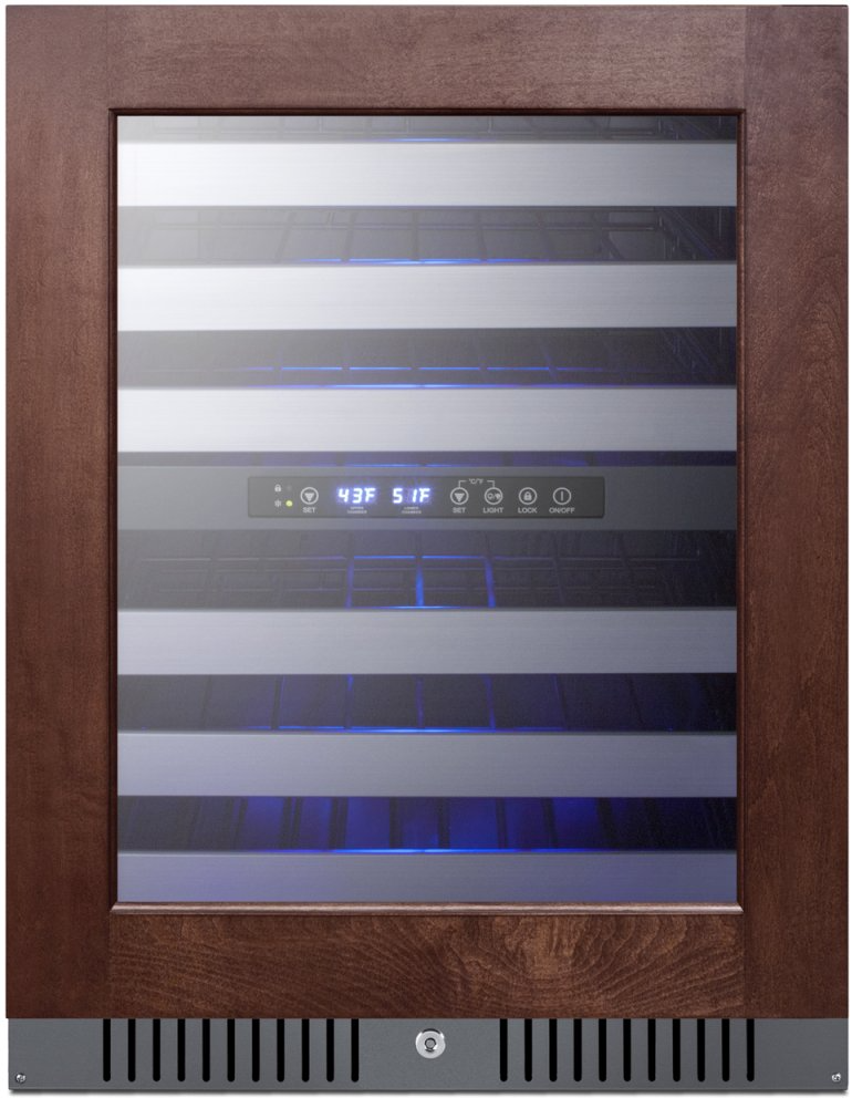 Summit's extensive selection of built-in undercounter wine cellars includes ADA compliant choices with versatile designs for residential or commercial use. The ALWC532PNR is a dual zone wine cellar that is ETL-S listed to NSF-7 commercial standards. The front-breathing design allows built-in installation, while the fully finished black cabinet also enables freestanding use. Sized just under 32 inches high and 24 inches wide, this unit makes an ideal fit under lower ADA compliant counters. The double pane tempered glass door features a seamless stainless steel trim designed to accept overlay panels, allowing you to match the wine cellar to your own cabinetry. Users provide their own handle to complete the custom look. A factory-installed lock offers added security and a stainless steel kickplate completes the look. This unit ships with a right hand door swing. If you require the door to open from the other side, add option "LHD." - *CUSTOM PANEL & HANDLE SOLD SEPARATELY*Read More