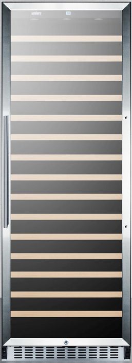 SUMMIT SWC1926 is a full-sized wine cellar designed for optimum wine storage with user-friendly convenience. Sized at just under 24" wide and 27" deep, the SWC1926 can store up to 171 standard 750ml Bordeaux bottles on slide-out wooden shelves. Alternatively, this unit can hold up to 128 wider Burgundy style bottles (typically used for Chardonnay or Pinot Noir) or a combination of 14 champagne bottles and 154 Bordeaux bottles. A digital thermostat makes it easy to adjust the temperature between 41ºF and 72ºF for red or white wine storage, with an LED temperature display that can be shown in Celsius or Fahrenheit. Recessed LED lighting offers an attractive touch. Additional features include a Sabbath mode setting, open door alarm, temperature memory function in case of power loss, and high temperature alarm for added protection. The SWC1926 has a jet black cabinet and reversible stainless steel trimmed glass door that offers a full display of the interior. A sleek stainless steel handle completes the look, and a factory installed lock offers added security. This unit can be used freestanding or built-in with extra rear clearance. See the user manual for more information. With its ideal size and handy features, the SWC1926 is an elegant yet affordable wine cellar for full storage needs. For this unit with a dual zone design, see the SWC1966.