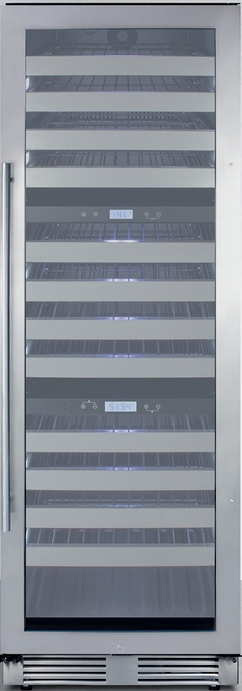 Inside, the SWCP1988TCSS includes 12 full-extension black wire shelves, four in each zone, positioned on ball bearing glides for smooth loading. Stainless steel fronts offer a modern touch. Optimal storage capacity accommodates up to 149 standard 750ml Bordeaux bottles (note: your capacity may vary depending on the bottle style). For wider Burgundy style bottles (typically used for Pinot Noir and Chardonnay), the SWCP1988T can hold up to 102 bottles. 13 white LED lights are positioned on the sides and top of the unit to attractively illuminate your collection for a stylish display. A charcoal filtration system keeps the interior odor-free. Additional features include an open door alarm and high/low temperature alarm that sound if the unit temperature goes out of range.