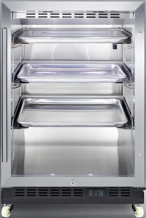 The SCR610BLRI comes in an easy-fitting 24" footprint, with a front-breathing design that can be built-in under counters or used freestanding. The reversible double pane tempered glass door includes a professional handle and a factory-installed lock, with stainless steel door trim to help highlight stored products. This unit comes pre-installed on a dolly with four 3" casters for easy mobility, perfect for restaurants and bars. The dolly can also be removed and reattached as needed. A digital thermostat is located in the kickplate for easy temperature management.