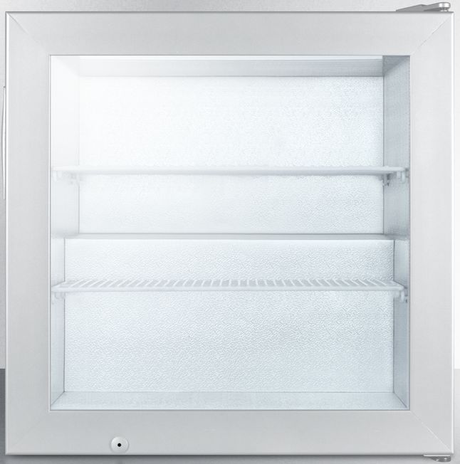 SUMMIT SCFU386FROST is a compact display freezer designed to store and display aluminum bottles and cans of beer at a glacial 24ºF. This commercially listed freezer comes fully featured for convenient use in commercial settings. A self-closing glass door helps to protect items from accidents, with an LED light providing an attractive presentation. Two wire shelves offer flexible storage and a factory installed lock offers security when needed. This unit features a digital thermostat pre-set to 24ºF, the coldest beer can be stored before freezing. The SCFU386FROST is ETL-S listed to NSF-7 for commercial use.