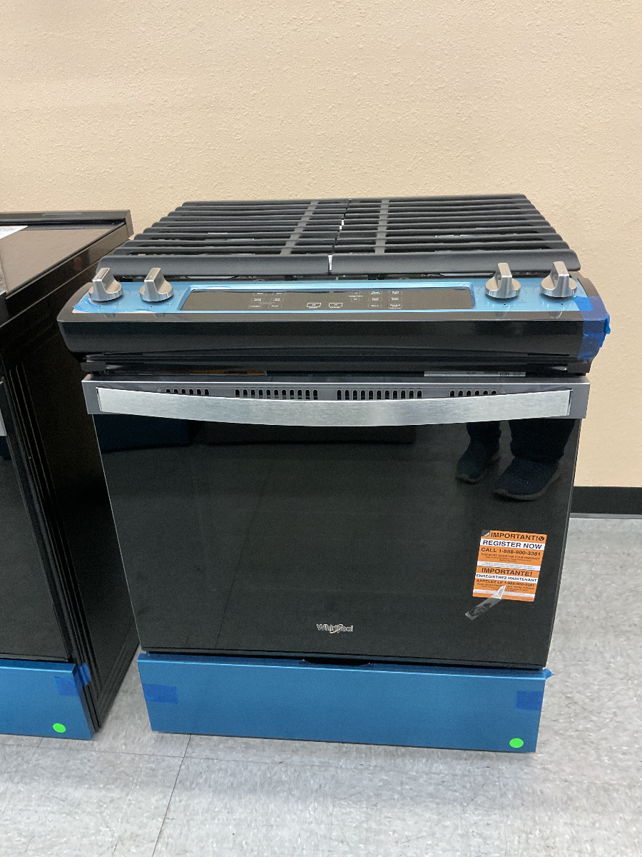 Whirlpool® 30" Slide In Gas Range-Black On Stainless with 5.0 cu. ft. total capacity, cast iron gates and sabbath modeRead More